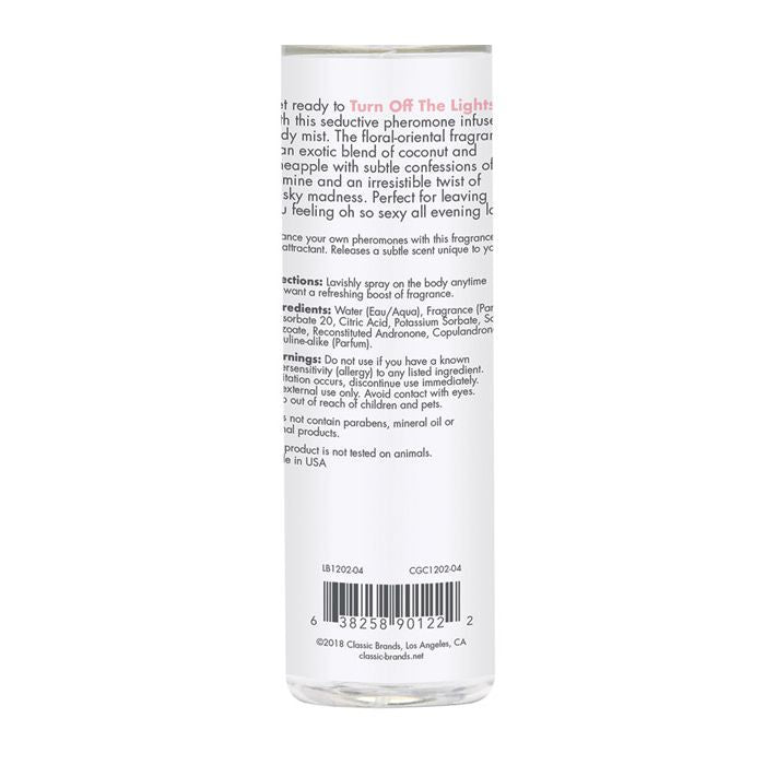 Get ready to Turn Off The Lights with this seductive pheromone infused perfumed body mist. The floral-oriental fragrance is an exotic blend of coconut and pineapple, with subtle confessions of jasmine and an irresistible twist of musky madness. Perfect for leaving you feeling oh so sexy all evening long. A medium floral, oriental fragrance. Ideal for a matinée movie date or an impromptu afternoon delight! Top Notes: Natural mandarin, fresh bergamot, melon and pineapple. Middle Notes: Tropical coconut, strawberry, gardenia, jasmine and marine accord. Base Notes: Musk, sandalwood, patchouli, vanilla and tonka. Enhances natural pheromone production to boost sex appeal. Formula blends with skin pH to release a unique one-of-a-kind scent. May also be used to fragrance favorite linens and lingerie. This product does not contain parabens, mineral oil or animal products. This product is not tested on animals