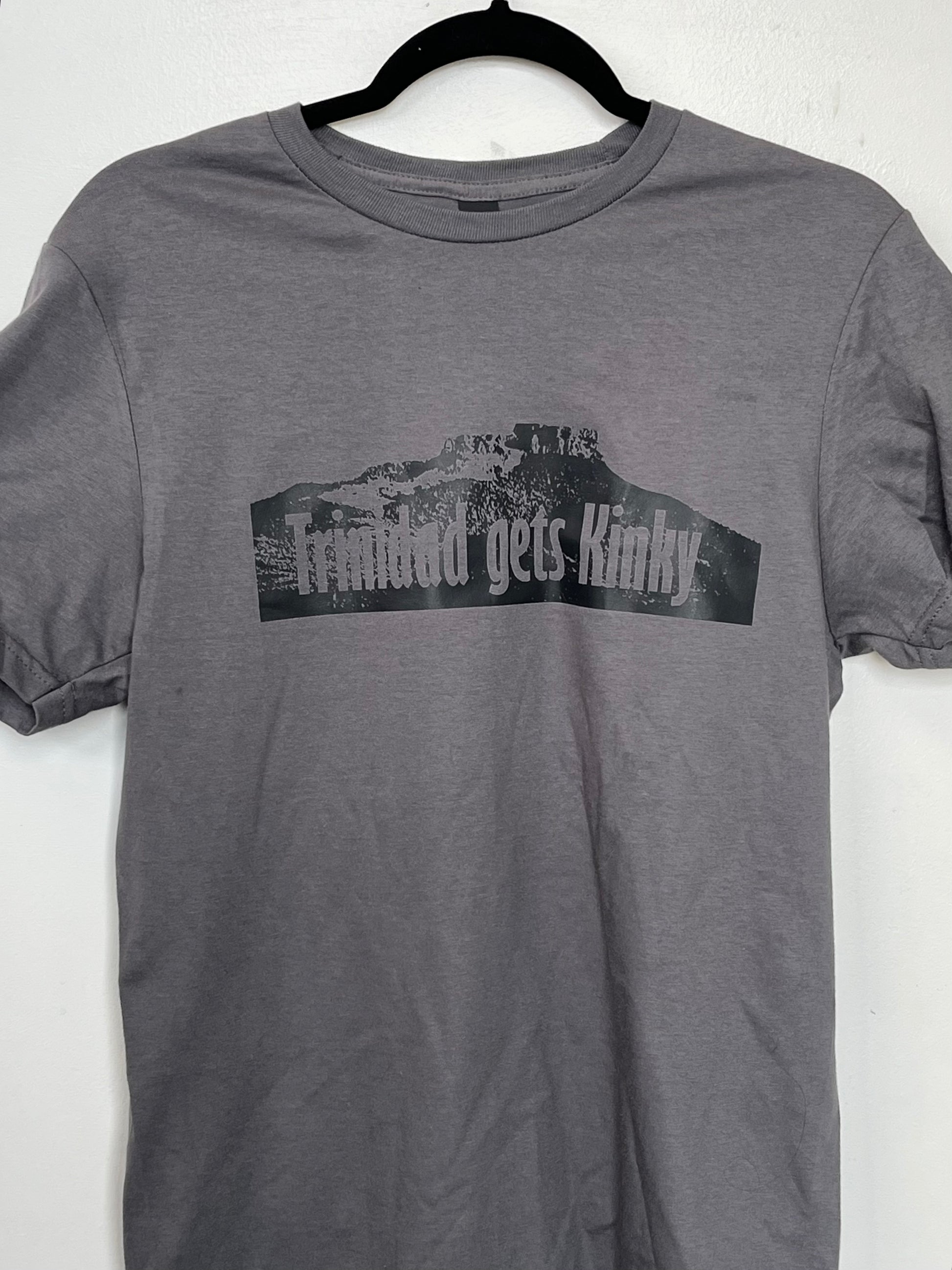 Short-Sleeve Gildan SoftStyle unisex grey T-shirts featuring an image of snow-capped Fisher's Peak and "Trinidad Gets Kinky." 100% Cotton